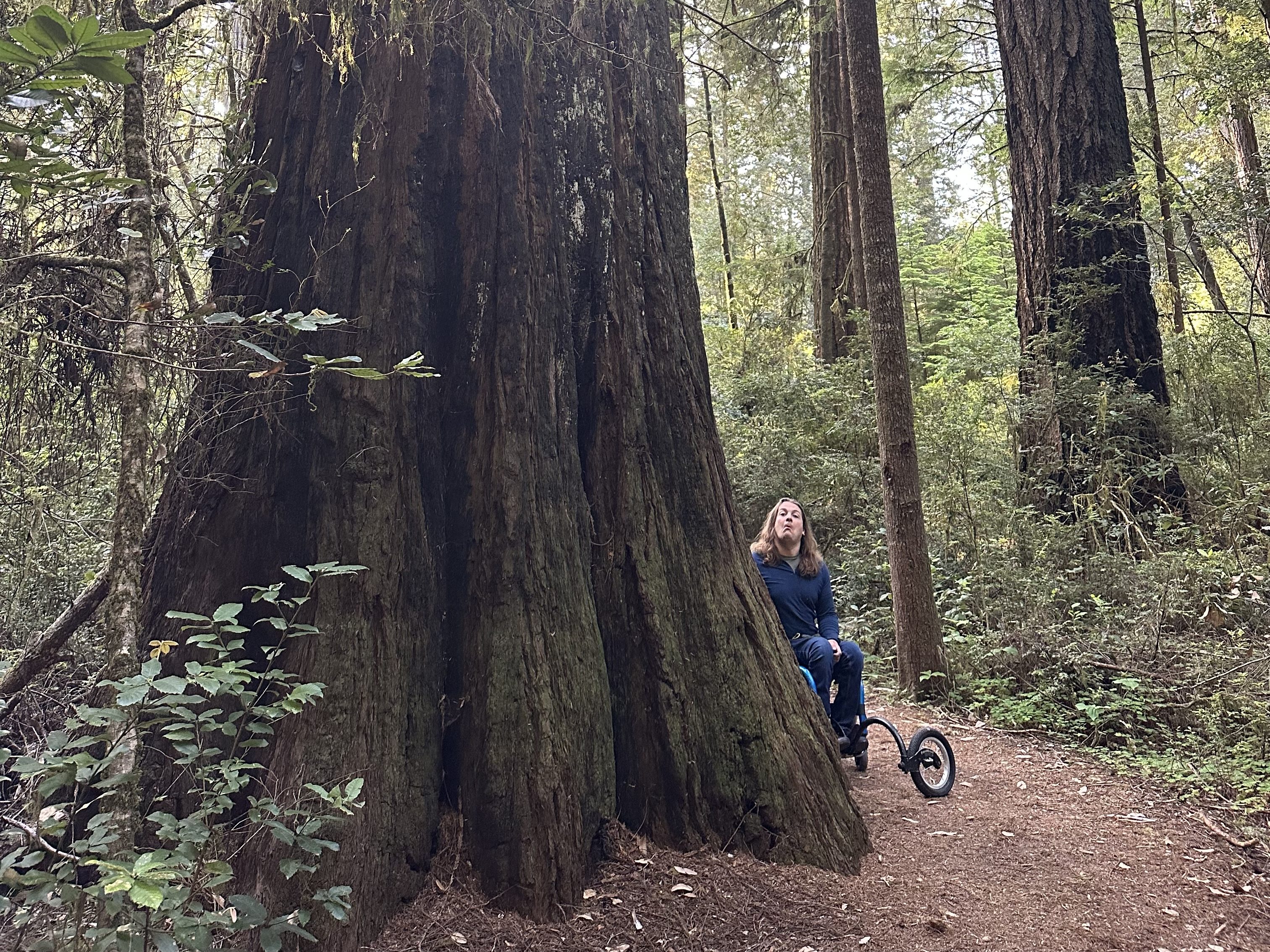 Campsites are surrounded by dense brush and trees (incl. massive redwoods). Site #37 is beautiful, packed dirt + gravel, near the visitor’s center, amphitheater and wheelchair-accessible restrooms. There is a nature trail in the campground, half of which is wheelchair accessible. It is fairly flat and terrain is packed soil. There are several other nature trails nearby that claim to be wheelchair accessible, but I have yet to check them out for myself.